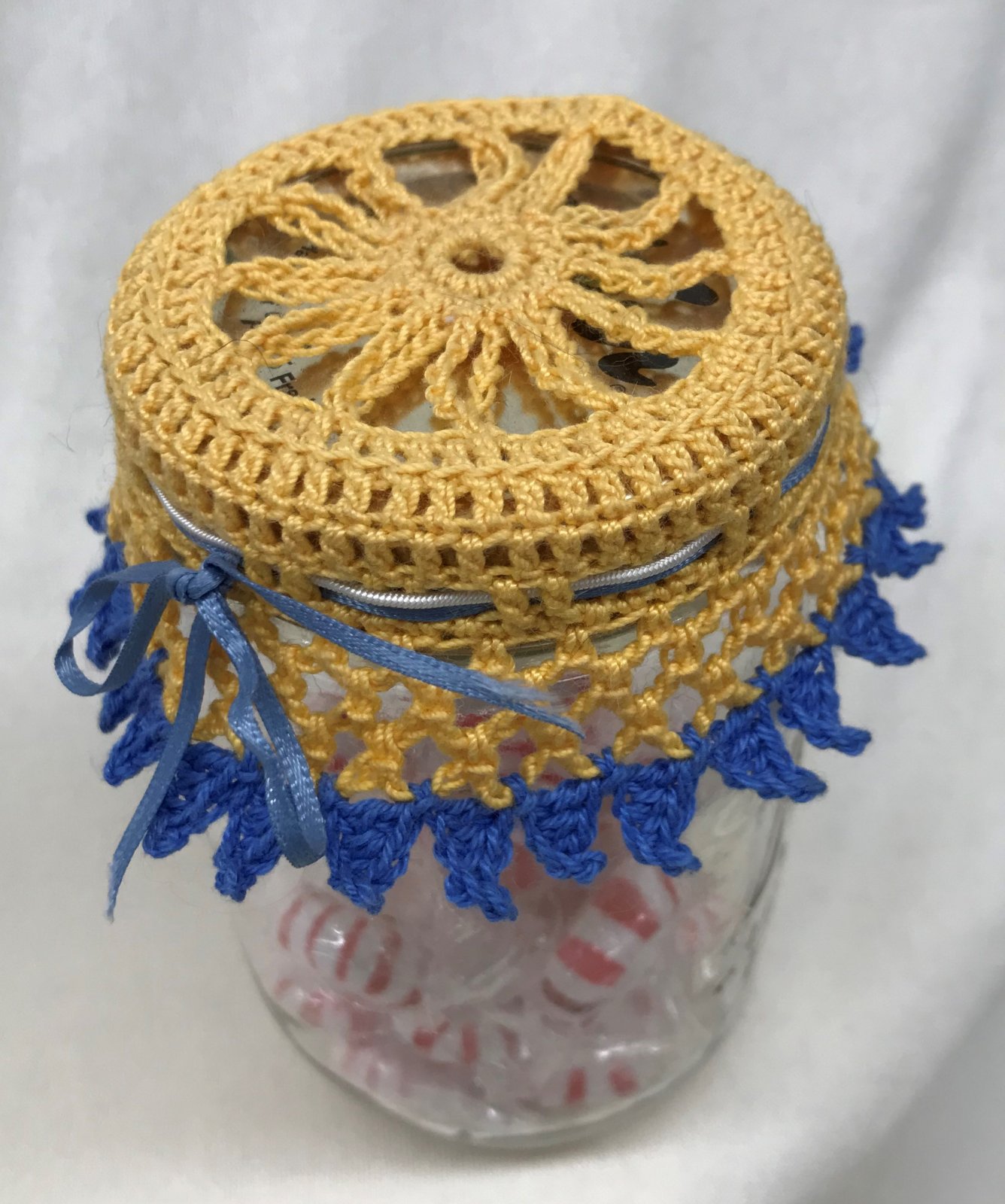Lacy Jar Doily in Sunny Day Colors with Ribbon, Mercerized Cotton Machine Wash/Dry Delicate - crocheted by Edith (Woolly Works Studio)