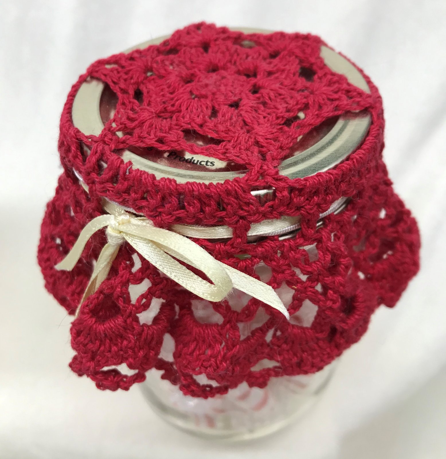 Lacy Jar Doily in Red with Ribbon, Mercerized Cotton Machine Wash/Dry Delicate - crocheted by Edith (Woolly Works Studio)
